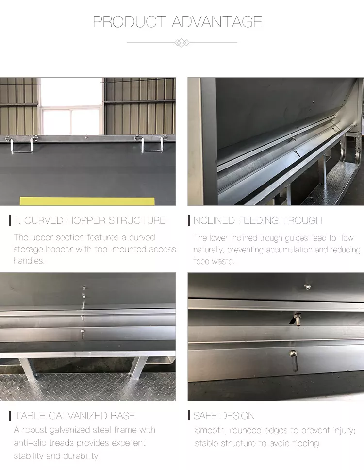 2. รางป้อนแบบเอียง: รางป้อนแบบเอียงด้านล่างช่วยป้อนอาหารให้ไหลตามธรรมชาติ ป้องกันการสะสมและลดของเสียจากฟีด