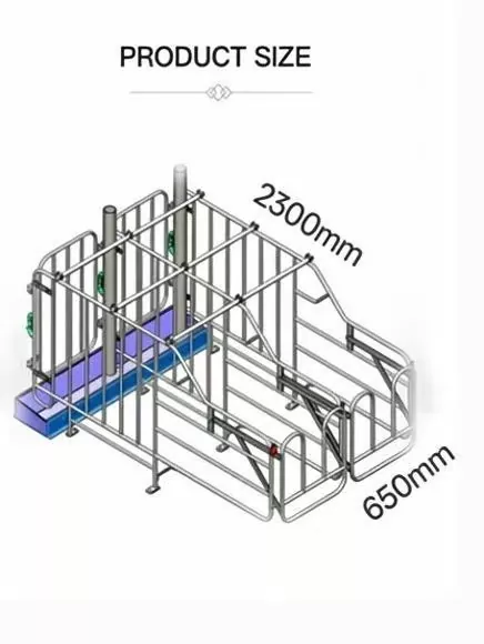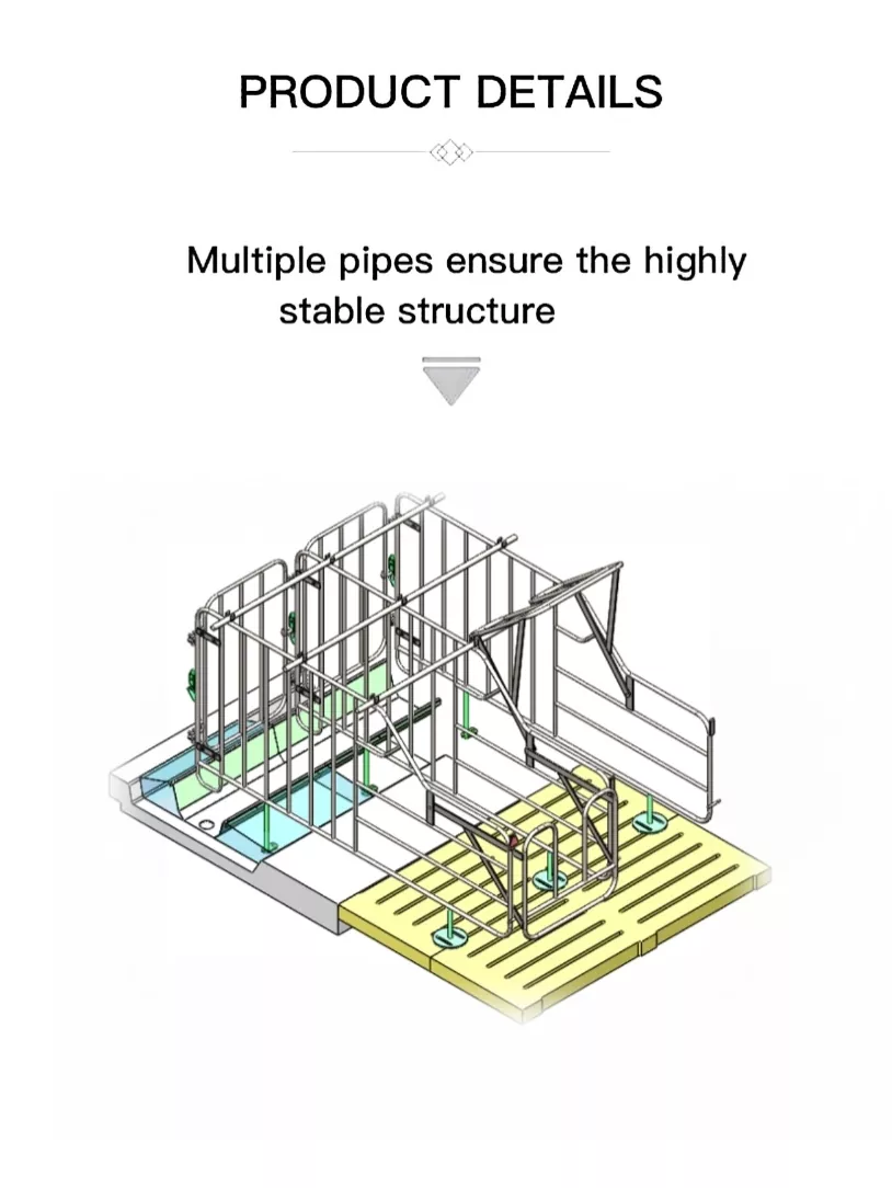 1. ประตูล็อคด้านหน้าที่ปลอดภัยพร้อมสลักที่เชื่อถือได้ป้องกันการหลบหนีของแม่สุกร โดยมีขอบโลหะโค้งมนเพื่อหลีกเลี่ยงการบาดเจ็บต่อสัตว์